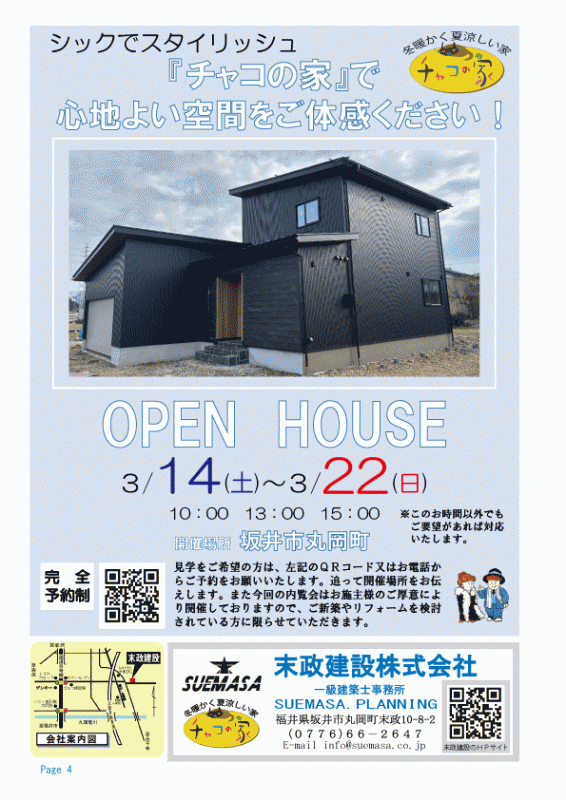 3月14日(土)~3月22日(日)、坂井市丸岡町にて『チャコの家』完成内覧会を開催いたします。